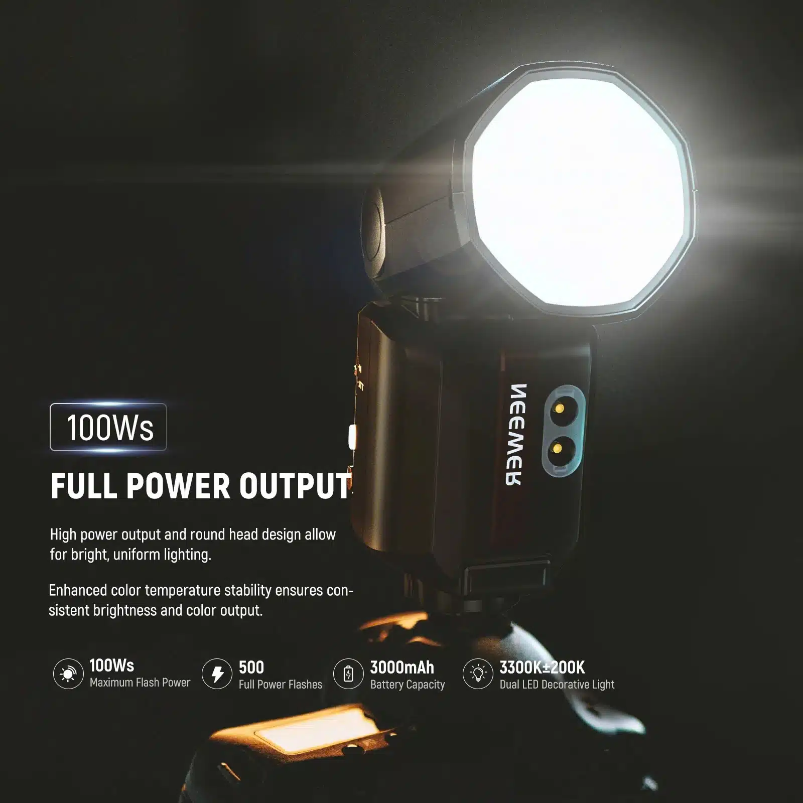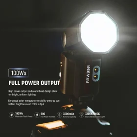 Công suất đầu ra 100Ws, với hệ thống làm mát hiệu quả, cho phép nháy liên tục tới 100 lần mà không quá nhiệt.