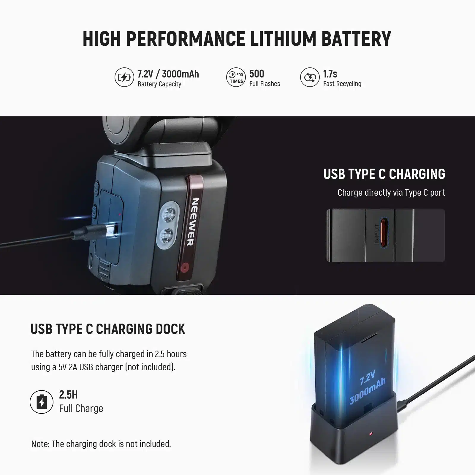 Pin 7.2V / 3000mAh cung cấp 500 lần nháy công suất tối đa. Tái chế nhanh 1.5 – 1.7 giây. Hỗ trợ sạc ngoài qua cổng Type-C.